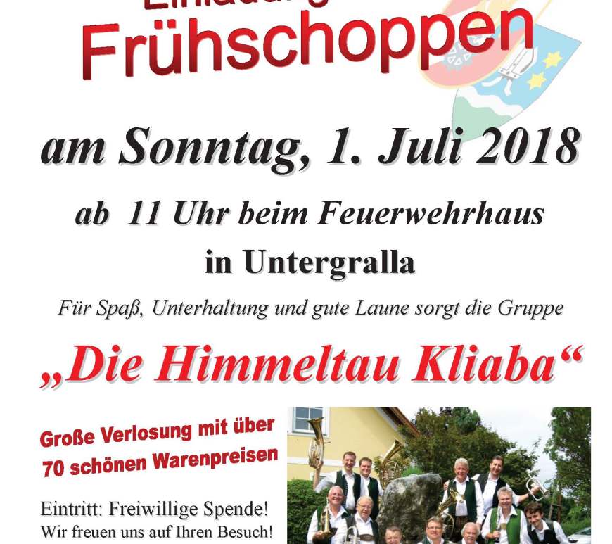 Die FF Untergralla lädt auch heuer wieder zum traditionellen Frühschoppen ganz herzlich ein. Heuer findet der Frühschoppen am 30. Juni ab 11.00 Uhr wieder beim Feuerwehrhaus Untergralla statt. Für Unterhaltung sorgt heuer wieder die Gruppe „Die Himmeltau Kliaba“ und es gibt bei der Verlosung wieder viele schöne Warenpreise zu gewinnen. Natürlich wird für Speis und Trank wieder in bewährter Weise gesorgt. Die FF Untergralla freut sich auf Euer … Frühschoppen 2019 weiterlesen